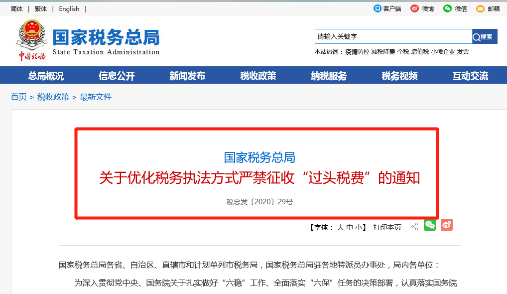 为深入贯彻党中央、国务院关于扎实做好“六稳”工作、落实“六保”任务的决策部署,认真落实国务院常务会议有关精神,进一步提升政治站位,充分发挥税收职能作用,统筹推进疫情防控和支持经济社会发展,现就优化税务执法方式、严禁征收“过头税费”有关要求进一步强调如下: